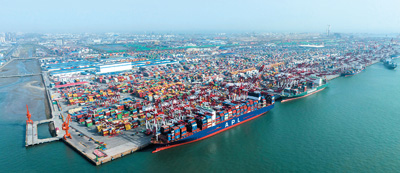 圖為(wei) 山東(dong) 港口青島港前灣集裝箱碼頭。