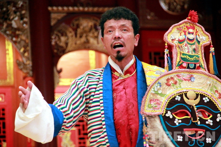 圖為(wei) 拉薩市城關(guan) 區娘熱民間藝術團演員洛桑卓瑪表演藏戲開場《溫巴頓》片段 攝影:劉莉
