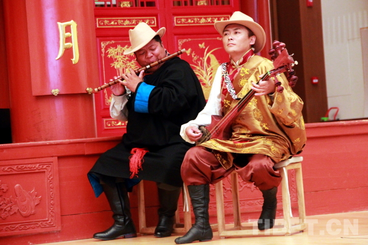 圖為(wei) 拉薩市城關(guan) 區娘熱民間藝術團樂(le) 師米瑪(左)和拉巴次仁(右)為(wei) 演出伴奏。米瑪是西藏自治區級嘎爾傳(chuan) 承人,擔任藝術團笛子演奏、司鼓;拉巴次仁是拉薩市城關(guan) 區級喇嘛瑪尼傳(chuan) 承人,擔任藝術團紮木年演奏。攝影:劉莉