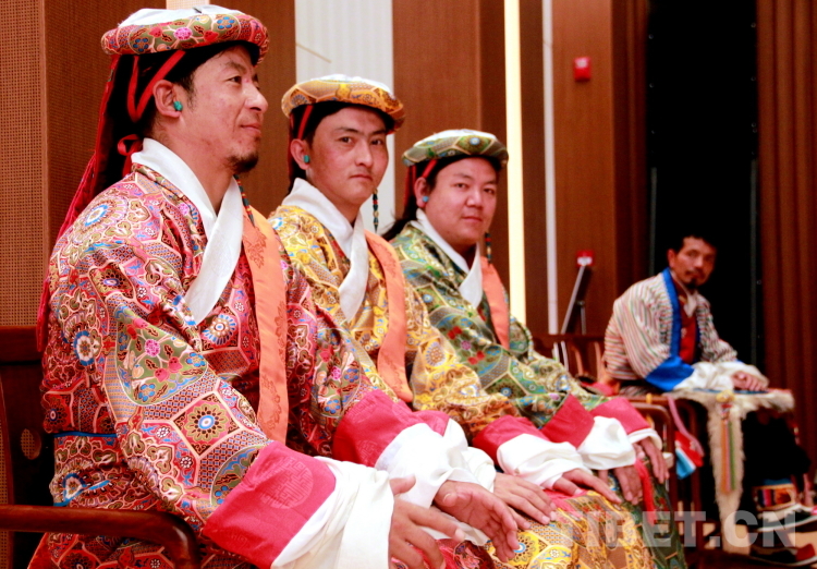 圖為(wei) 拉薩市城關(guan) 區娘熱民間藝術團演員索朗(左一,拉薩市城關(guan) 區級覺木隆藏戲傳(chuan) 承人),多吉次仁(左二)、晉巴(左三,拉薩市城關(guan) 區級覺木隆藏戲傳(chuan) 承人)和洛桑次仁正在候場攝影:劉莉