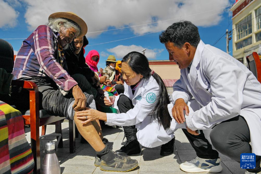 8月18日,在阿裏地區措勤縣曲洛鄉(xiang) ,西藏阜康腫瘤醫院康複理療師唐穎(右二)為(wei) 當地群眾(zhong) 義(yi) 診。新華社記者 張汝鋒 攝