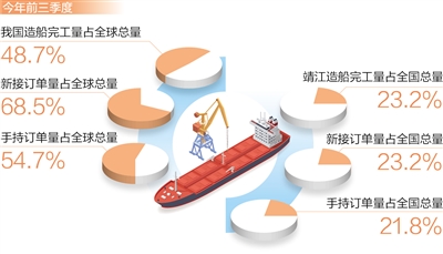 今年前三季度,我國造船完工量、新接訂單量和手持訂單量以載重噸計分別占全球總量的48.7%、68.5%和54.7%,均居世界第一。在江蘇泰州靖江市,當地造船企業(ye) 的訂單排到了2026年,成為(wei) 我國船舶業(ye) 轉型升級、穩步向好的縮影。