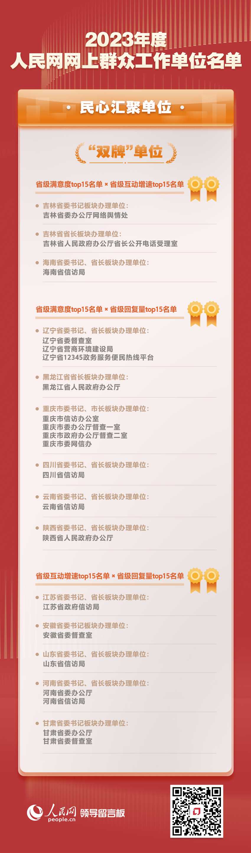 此次公布的名單綜合全國各地區各部門各單位近一年來的滿意度、互動增速、回複量等指數,著重突出各地區各部門各單位依托人民網“領導留言板”開展網上群眾(zhong) 工作情況,選出2023年度人民網網上群眾(zhong) 工作“民心匯聚單位”“實幹擔當單位”“匯智為(wei) 民單位”和“活力奮進單位”。