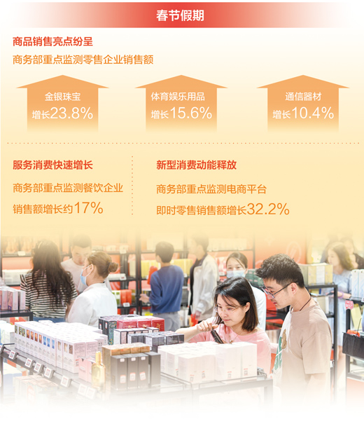 數據顯示,春節假期商品銷售亮點紛呈。春節假期,節慶商品、國貨潮品、綠色智能產(chan) 品等持續旺銷。商務部重點監測零售企業(ye) 金銀珠寶、體(ti) 育娛樂(le) 用品、通信器材銷售額同比分別增長23.8%、15.6%和10.4%。