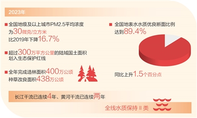 2023年,全國地級及以上城市PM2.5平均濃度為(wei) 30微克/立方米,比2019年下降16.7%;全國地表水水質優(you) 良斷麵比例達到89.4%,同比上升1.5個(ge) 百分點;超過300萬(wan) 平方公裏的陸域國土麵積劃入生態保護紅線。
