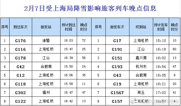 據@北京南站官方微博消息,受上海局降雪影響,北京南站京滬高鐵部分到達、始發列車有不同程度晚點。截至目前,具體(ti) 晚點情況信息如下,請廣大旅客及時關(guan) 注12306官方信息和車站公告。