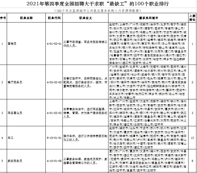 記者注意到,在人社部發布的2021年第四季度全國招聘大於(yu) 求職“最缺工”的100個(ge) 職業(ye) 排行中,營銷員、餐廳服務員、商品營業(ye) 員、車工、家政服務員位列“最缺工”職業(ye) 前五位。與(yu) 2021年第三季度相比,第四季度排行反映出製造業(ye) 缺工狀況持續,“智能製造”領域缺工程度加大。