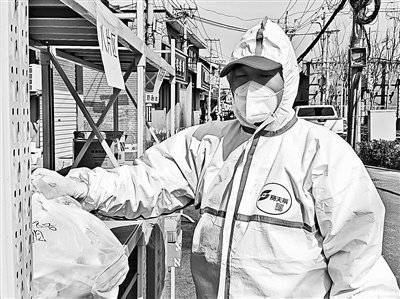 4月7日一早,在望京西園三區北門附近的管控區硬質隔離圍欄內(nei) ,小區物資配送小組工作人員正忙著將當日的居民物資、快遞等進行登記、分揀和消毒。隨後這些物資被分別送往每棟樓下的快遞架,再通知居民下樓自取。