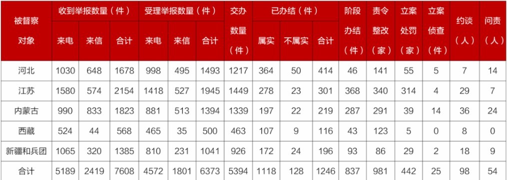 截至4月10日22時,各督察組共收到群眾(zhong) 來電、來信舉(ju) 報7608件,受理有效舉(ju) 報6373件,經梳理合並重複舉(ju) 報,累計向被督察對象轉辦5394件;被督察對象已辦結或階段辦結2083件,其中立案處罰442家;立案偵(zhen) 查25件;約談黨(dang) 政領導幹部98人,問責黨(dang) 政領導幹部54人。