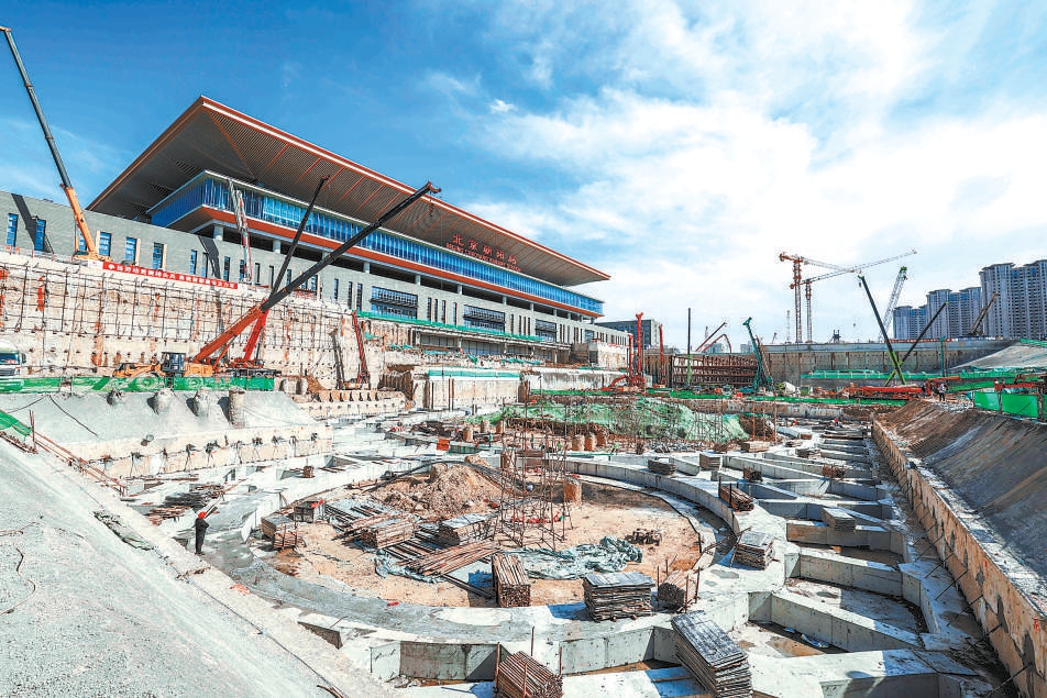 北京朝陽站交通樞紐項目14日完成雙環梁板混凝土澆築。本報記者 潘之望攝