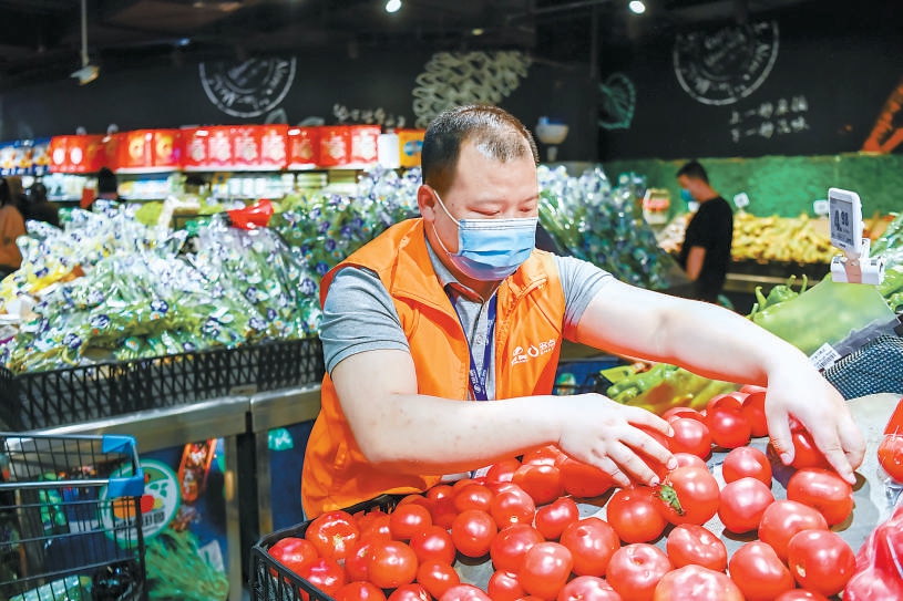 物美雙井店店長宋飛飛在賣場查看蔬果銷售情況。本報記者 鄧偉(wei) 攝