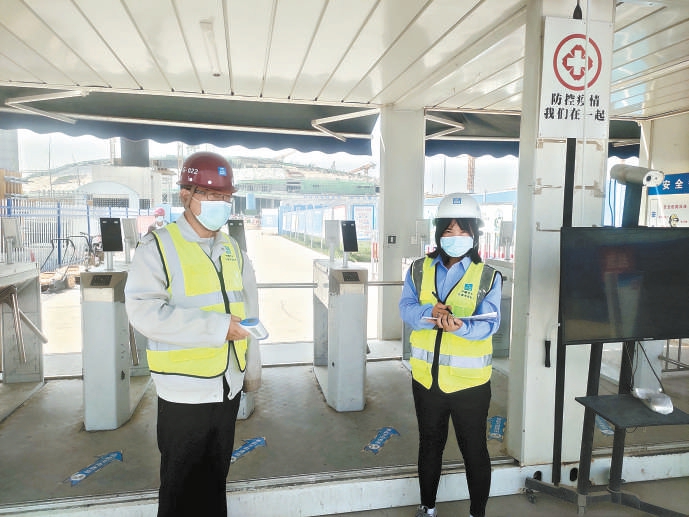駱中月與(yu) 張建英(右)在項目門口檢查防疫情況。