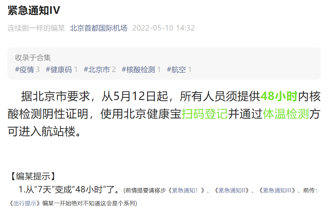 首都機場:5月12日起,進入航站樓須持48小時內核酸檢測陰性證明