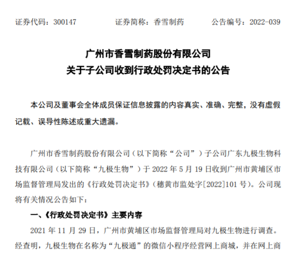 對此,香雪製藥表示,已要求九極生物主動調整生產(chan) 計劃,更改下架相關(guan) 廣告;對相關(guan) 責任人員進行處罰;組織工作人員對相關(guan) 法律法規進行學習(xi) ,完善內(nei) 部管理製度與(yu) 操作規程,嚴(yan) 格按照規定對產(chan) 品宣傳(chuan) 進行規範管理。截至本公告披露日前,相關(guan) 整改已完成。