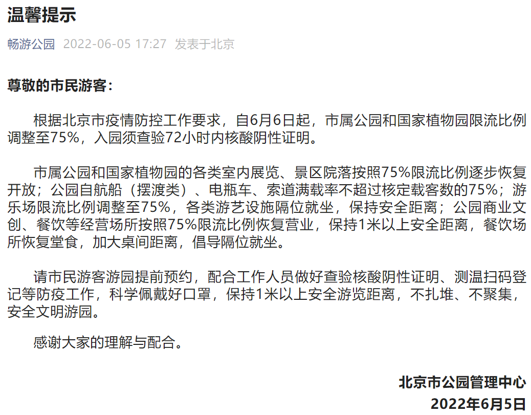 央廣網北京6月6日消息 據北京市公園管理中心消息,根據北京市疫情防控工作要求,自6月6日起,市屬公園和國家植物園限流比例調整至75%,入園須查驗72小時內(nei) 核酸陰性證明。