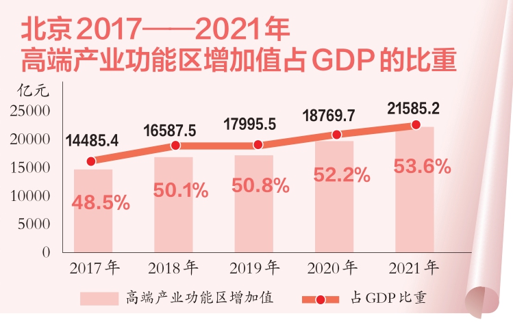 重點功能區呈現集聚效應。中關(guan) 村國家自主創新示範區等高端產(chan) 業(ye) 功能區占據全市經濟總量的半壁江山,2021年實現增加值2.2萬(wan) 億(yi) 元,占全市GDP的53.6%,比2016年提高5.3個(ge) 百分點。