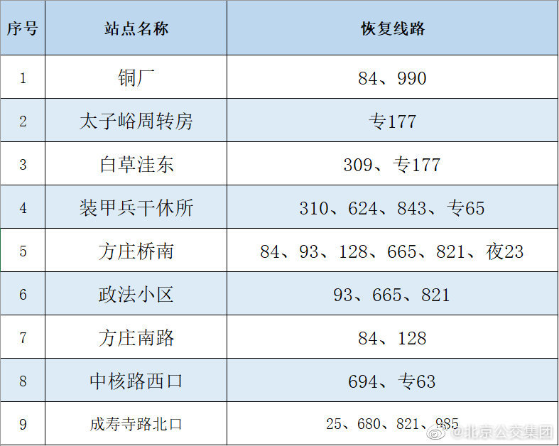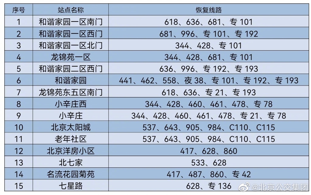 央廣網北京6月16日消息 據北京公交集團官博消息,按照防疫工作要求,自2022年6月16日首班車起,對前期途經昌平區封管控區域周邊采取甩站措施的35條線路以及前期途經豐(feng) 台區封管控區域周邊采取甩站措施的18條線路,恢複正常運營,恢複信息詳見下表。