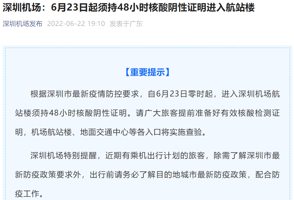 深圳機場:6月23日起須持48小時核酸陰性證明進入航站樓