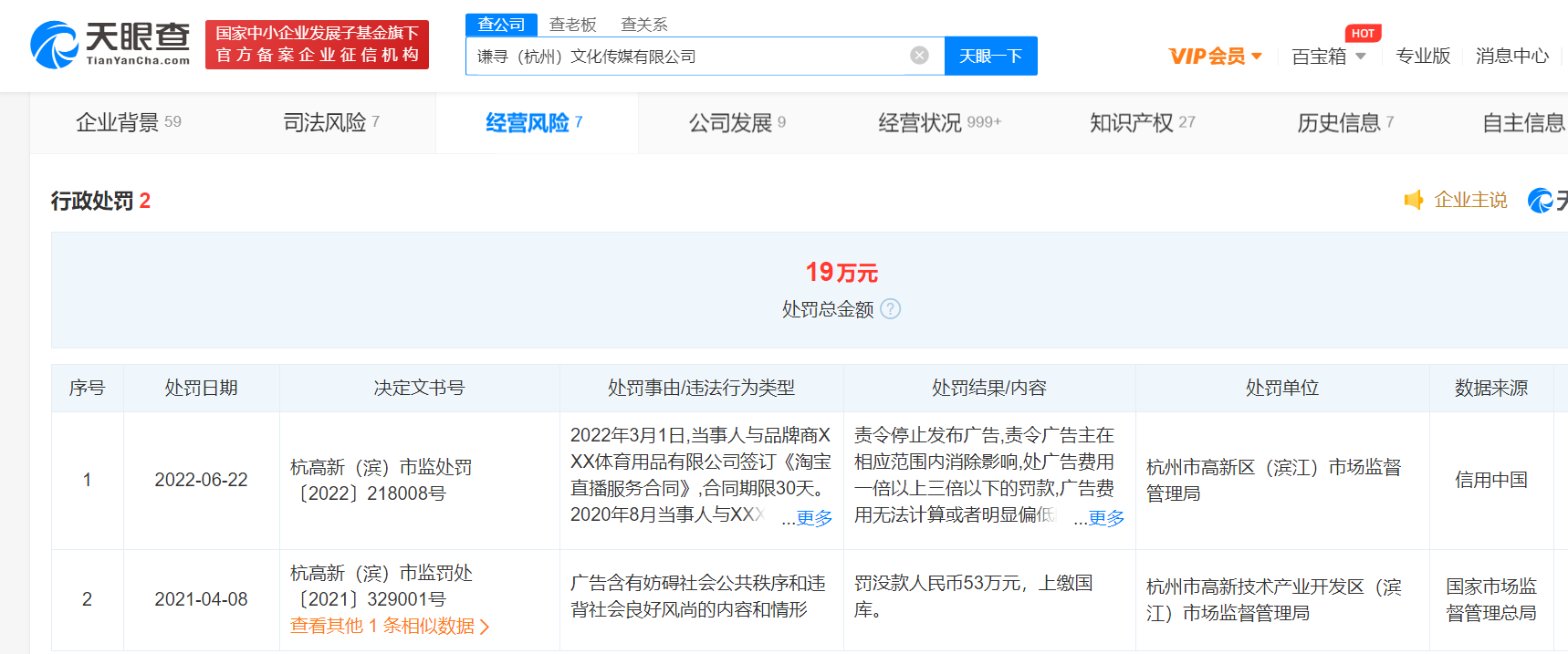 央廣網北京6月27日消息(記者 楊柳青) 近日,謙尋(杭州)文化傳(chuan) 媒有限公司因違反廣告法,被杭州市高新區(濱江)市場監督管理局罰款19萬(wan) 元。