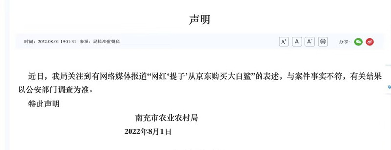 事件被越來越多人關(guan) 注,公安部門已經介入。平台地址顯示“提子”位於(yu) 四川南充,當地農(nong) 業(ye) 農(nong) 村局的工作人員2日下午向記者證實,已將涉事鯊魚送往鑒定機構。“我們(men) 之前執法監督科送檢了一部分,這個(ge) 案件現在是刑事案件,公安機關(guan) 在這邊處理。”
