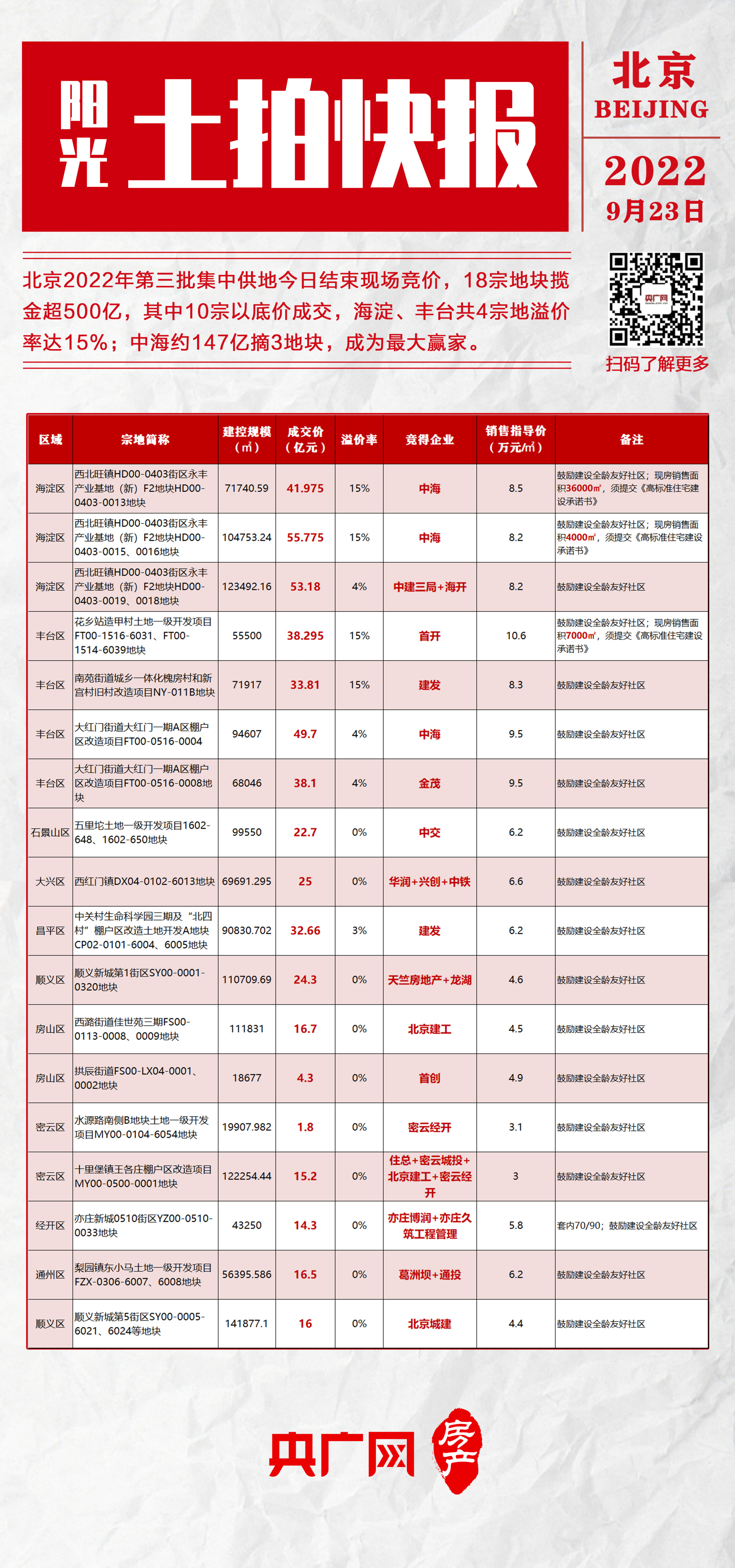 央廣網北京9月23日消息(記者門庭婷)9月23日,北京市2022年第三批集中供地落下帷幕,本次共出讓18宗商品住宅用地,共計攬金500.295億(yi) 元,總土地麵積約74.8萬(wan) ㎡,總建築麵積約148萬(wan) ㎡。