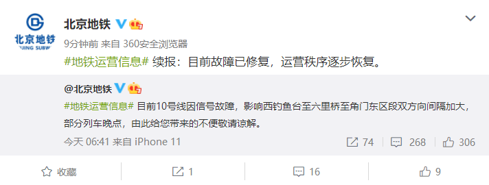 北京地鐵:10號線故障已修複,運營秩序逐步恢複