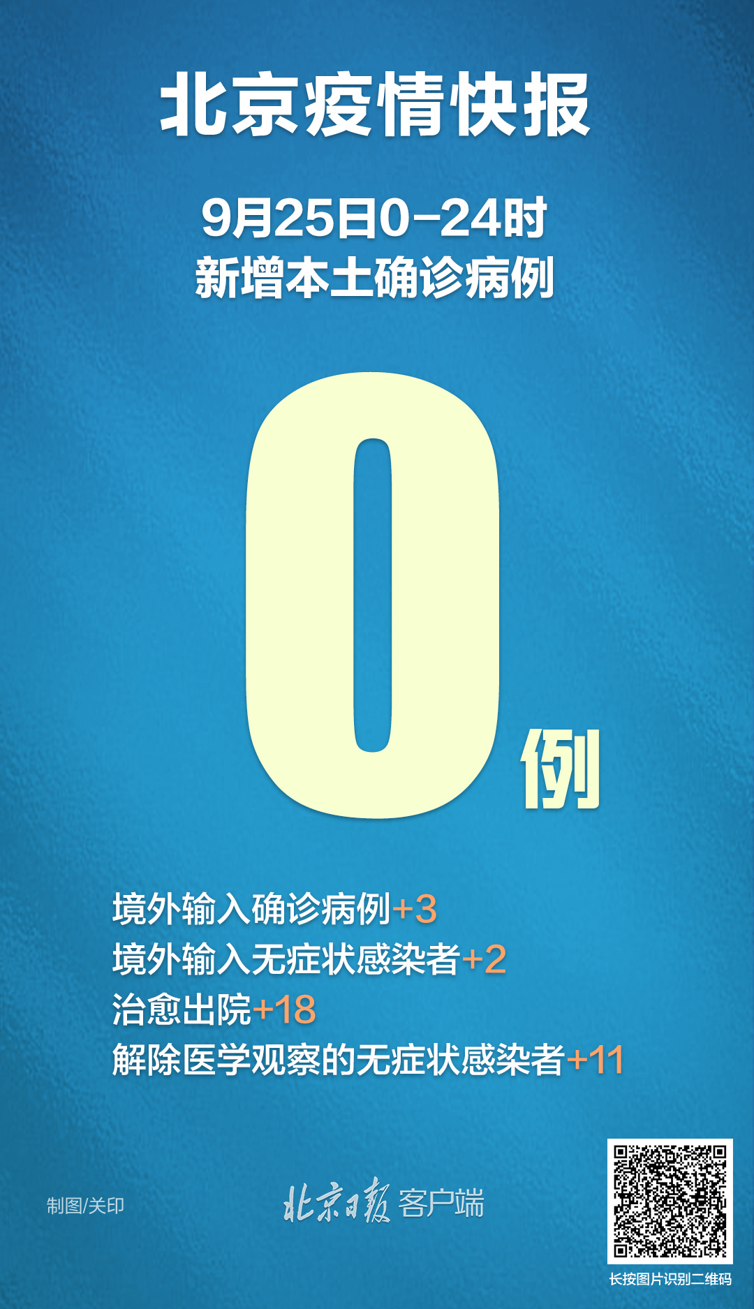 9月25日0時至24時,北京無新增本土確診病例、疑似病例和無症狀感染者;新增3例境外輸入確診病例和2例無症狀感染者,無新增疑似病例。治愈出院18例,解除醫學觀察的無症狀感染者11例。