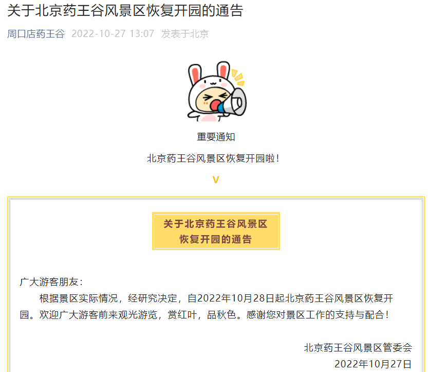 央廣網北京10月27日消息 據周口店藥王穀微信號消息,根據景區實際情況,經研究決(jue) 定,自2022年10月28日起北京藥王穀風景區恢複開園。歡迎廣大遊客前來觀光遊覽,賞紅葉,品秋色。
