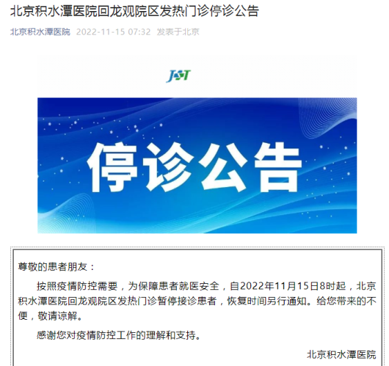 據北京積水潭醫院微信公眾(zhong) 號消息,按照疫情防控需要,為(wei) 保障患者就醫安全,自2022年11月15日8時起,北京積水潭醫院回龍觀院區發熱門診暫停接診患者,恢複時間另行通知。給您帶來的不便,敬請諒解。