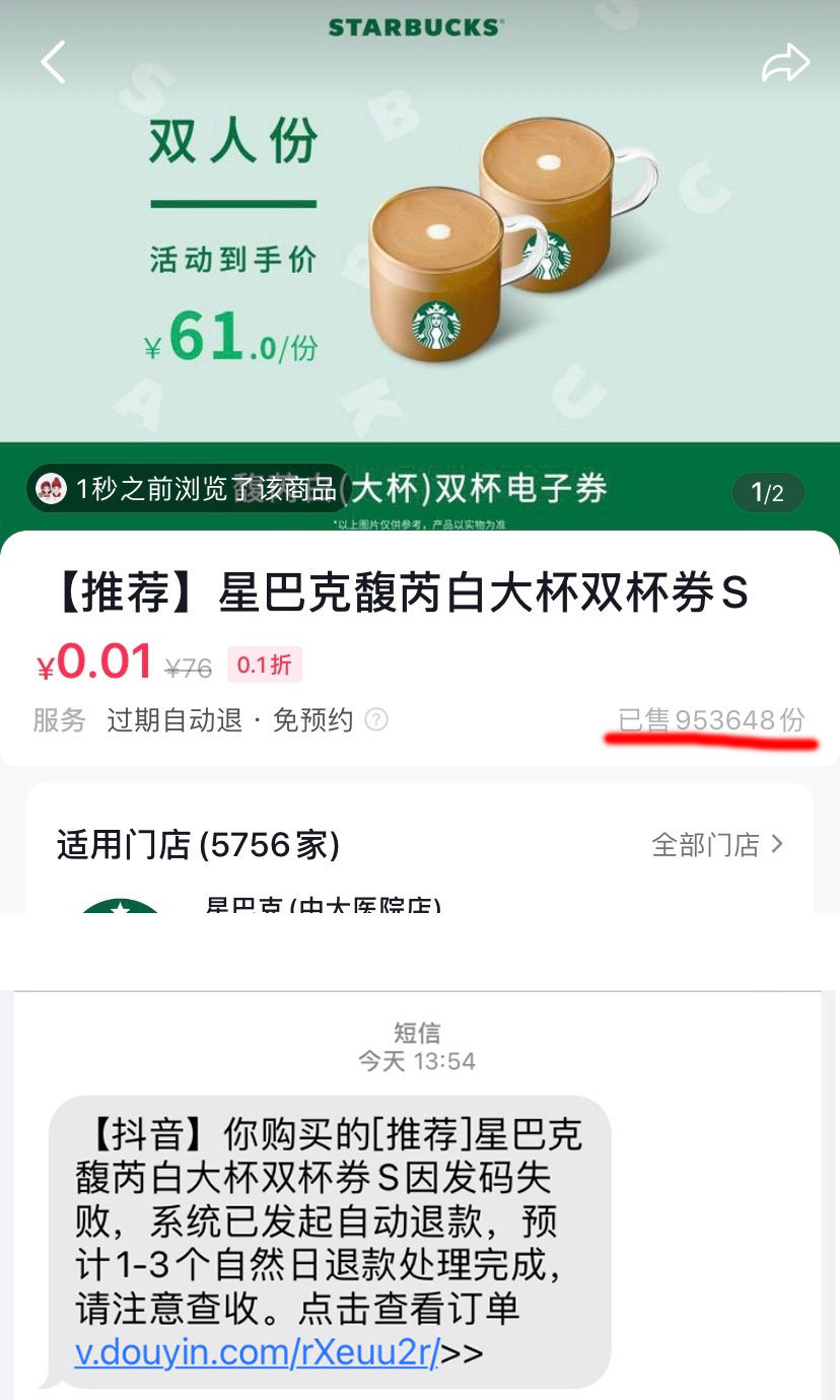 央廣網記者注意到,23日有多名網友在社交平台微博反饋,星巴克近日在某平台推出0.01元購2杯馥芮白咖啡券團購活動,賣出95萬(wan) 多單。但是不少消費者表示搶券後,發現無法兌(dui) 換,被星巴克自動退款了。