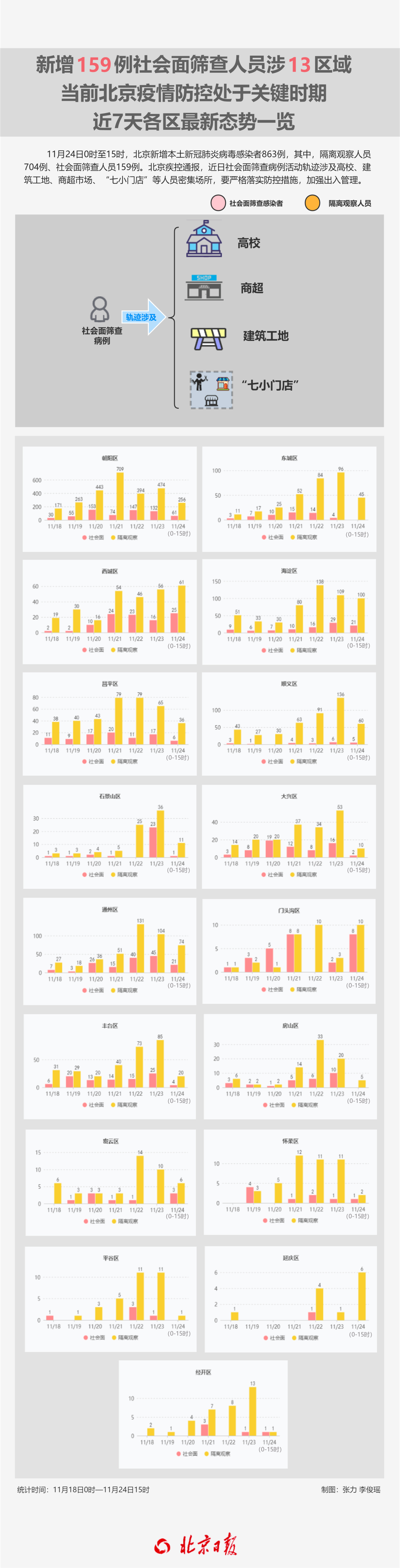 11月24日0時至15時,北京新增本土新冠肺炎病毒感染者863例,其中,隔離觀察人員704例、社會(hui) 麵篩查人員159例;朝陽區317例,海澱區121例,通州區95例,西城區86例,順義(yi) 區65例,東(dong) 城區45例,昌平區42例,豐(feng) 台區24例,門頭溝區18例,石景山區、大興(xing) 區各12例,密雲(yun) 區9例,延慶區6例,房山區5例,懷柔區3例,經開區2例,平穀區1例;重型3例、普通型2例、輕型164例、無症狀感染者694例。