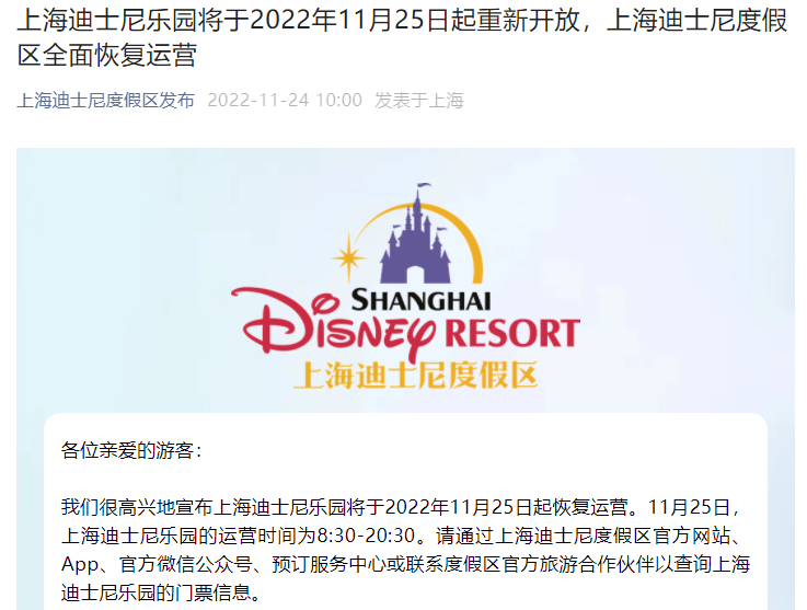 此外,迪士尼小鎮、星願公園和上海迪士尼樂(le) 園酒店已於(yu) 日前恢複運營。上海迪士尼樂(le) 園和玩具總動員酒店的重新開放標誌著上海迪士尼度假區全麵恢複運營。