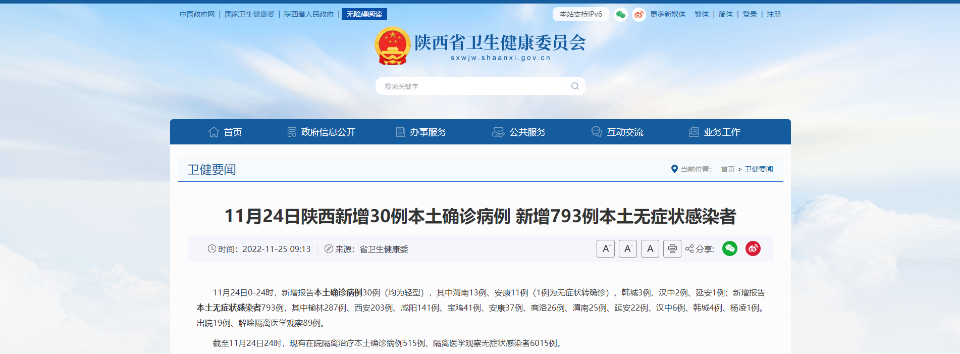 央廣網西安11月25日消息(記者王禕萍)據陝西省衛生健康委消息,11月24日0-24時,陝西新增報告本土確診病例30例(均為(wei) 輕型),其中渭南13例、安康11例(1例為(wei) 無症狀轉確診)、韓城3例、漢中2例、延安1例;新增報告本土無症狀感染者793例,其中榆林287例、西安203例、鹹陽141例、寶雞41例、安康37例、商洛26例、渭南25例、延安22例、漢中6例、韓城4例、楊淩1例。出院19例、解除隔離醫學觀察89例。