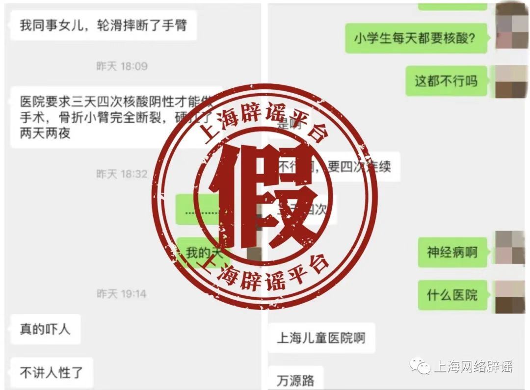 “上海一醫院要求兒(er) 童三天四次核酸才能做手術,孩子骨折小臂斷裂,硬抗了兩(liang) 天兩(liang) 夜。”不久前,一條聊天記錄在陸先生的家屬群引發熱議。因為(wei) 表姐一家生活在上海,親(qin) 戚還特意提醒她照顧好孩子。而很快,官方發布辟謠消息,稱經過多路求證,聊天記錄中所指醫院並沒有三天四次核酸檢測陰性才能手術的要求,院方也未核查到存在所傳(chuan) 相似情況的病人。