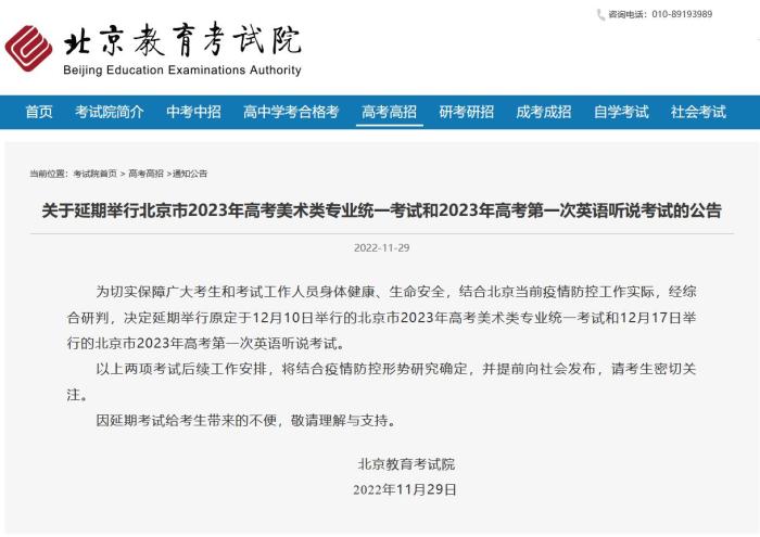 中新網11月29日電 據北京教育考試院網站消息,北京教育考試院29日發布公告,為(wei) 切實保障廣大考生和考試工作人員身體(ti) 健康、生命安全,結合北京當前疫情防控工作實際,經綜合研判,決(jue) 定延期舉(ju) 行原定於(yu) 12月10日舉(ju) 行的北京市2023年高考美術類專(zhuan) 業(ye) 統一考試和12月17日舉(ju) 行的北京市2023年高考第一次英語聽說考試。