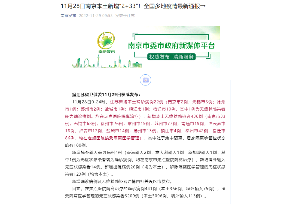 11月28日江蘇新增本土確診22例 新增本土無症狀436例