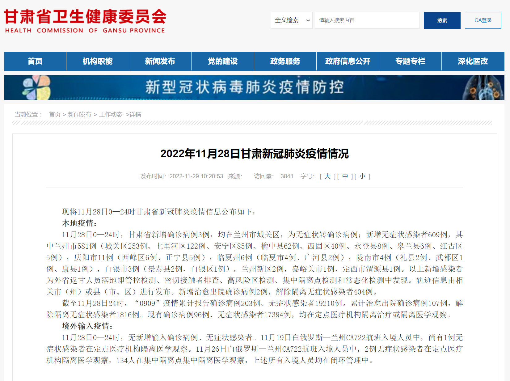 11月28日甘肅新增確診病例3例,無症狀感染者609例