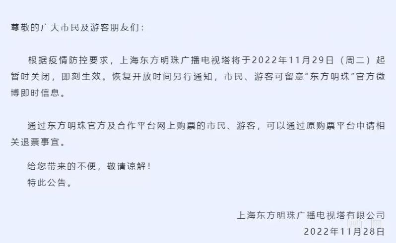 上海東(dong) 方明珠廣播電視塔有限公司28日晚發布公告稱,根據疫情防控要求,上海東(dong) 方明珠廣播電視塔於(yu) 2022年11月29日起暫時關(guan) 閉,即刻生效。恢複開放時間另行通知,市民、遊客可留意“東(dong) 方明珠”官方微博即時信息。
