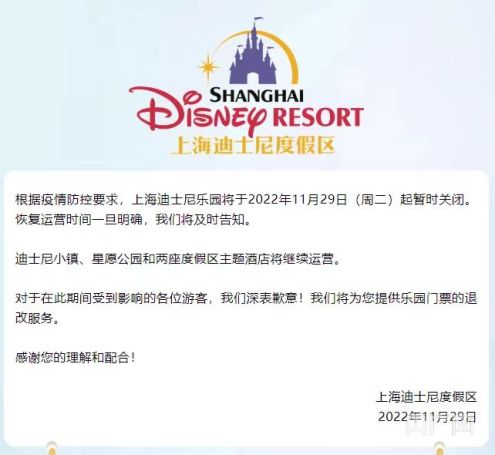 央廣網上海11月29日消息(記者林馥榆)記者從(cong) 上海迪士尼度假區獲悉,根據疫情防控要求,上海迪士尼樂(le) 園於(yu) 11月29日起暫時關(guan) 閉,恢複運營時間待定。