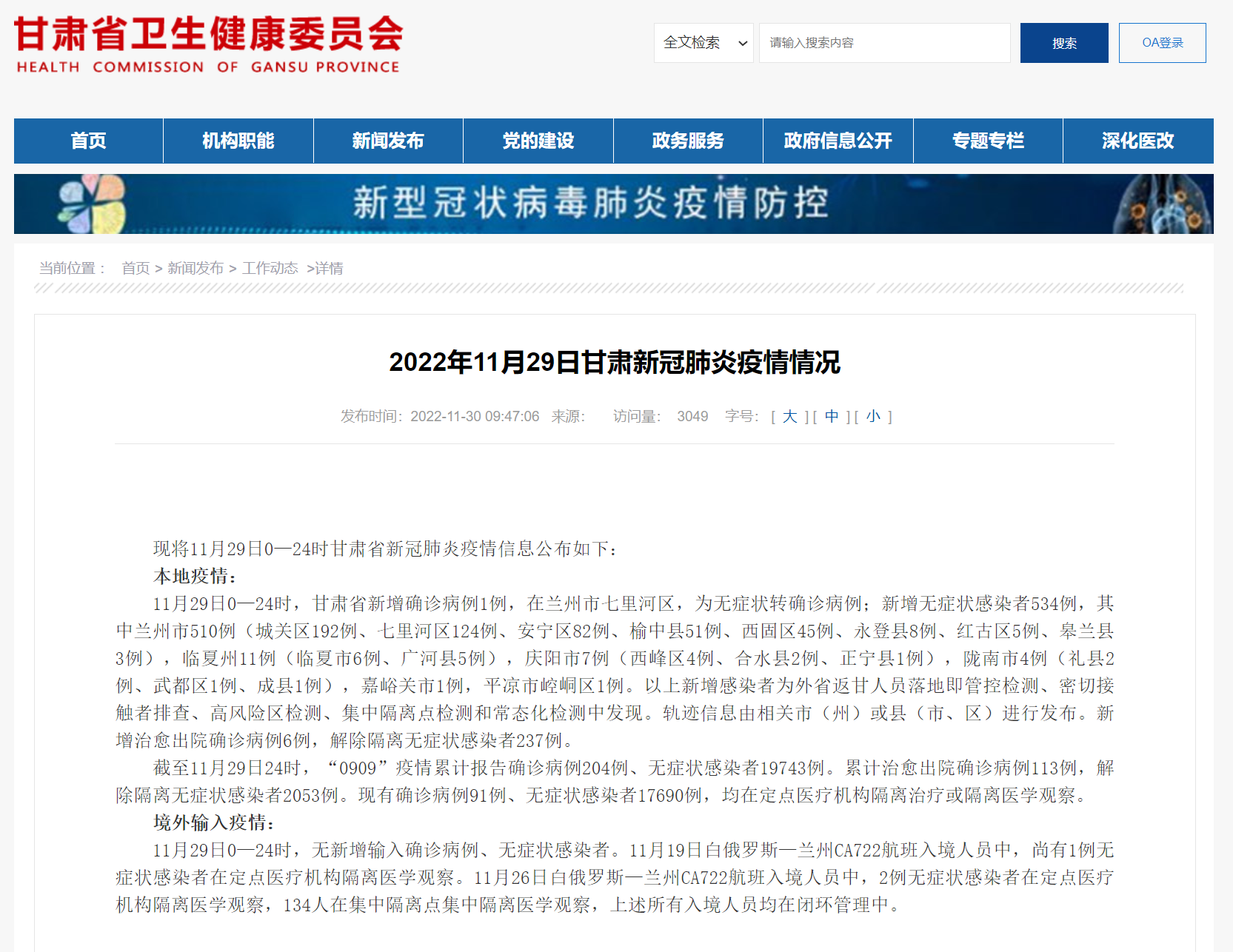 11月29日甘肅新增確診病例1例,無症狀感染者534例