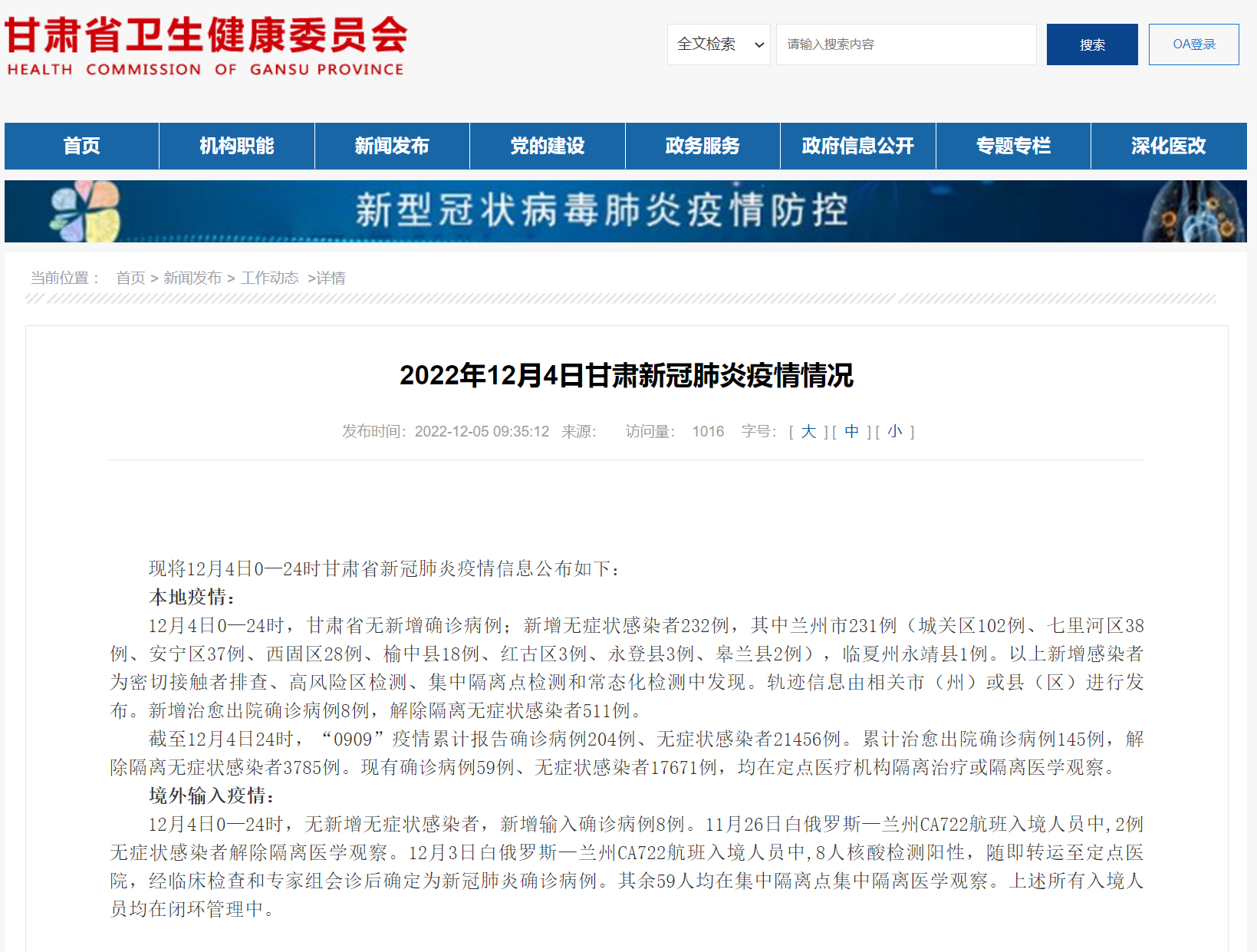 央廣網蘭(lan) 州12月5日消息(記者邸文炯)據甘肅省衛健委通報,12月4日0—24時,甘肅省無新增確診病例;新增無症狀感染者232例,其中蘭(lan) 州市231例(城關(guan) 區102例、七裏河區38例、安寧區37例、西固區28例、榆中縣18例、紅古區3例、永登縣3例、皋蘭(lan) 縣2例),臨(lin) 夏州永靖縣1例。以上新增感染者為(wei) 密切接觸者排查、高風險區檢測、集中隔離點檢測和常態化檢測中發現。軌跡信息由相關(guan) 市(州)或縣(區)進行發布。新增治愈出院確診病例8例,解除隔離無症狀感染者511例。