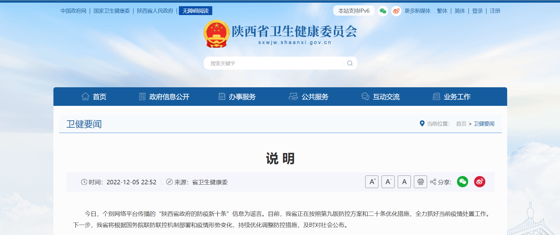 央廣網西安12月6日消息(見習(xi) 記者侯凱奇)12月5日晚,陝西省衛健委官網發布說明,明確提出個(ge) 別網絡平台傳(chuan) 播的“陝西省政府的防疫新十條”信息為(wei) 謠言。