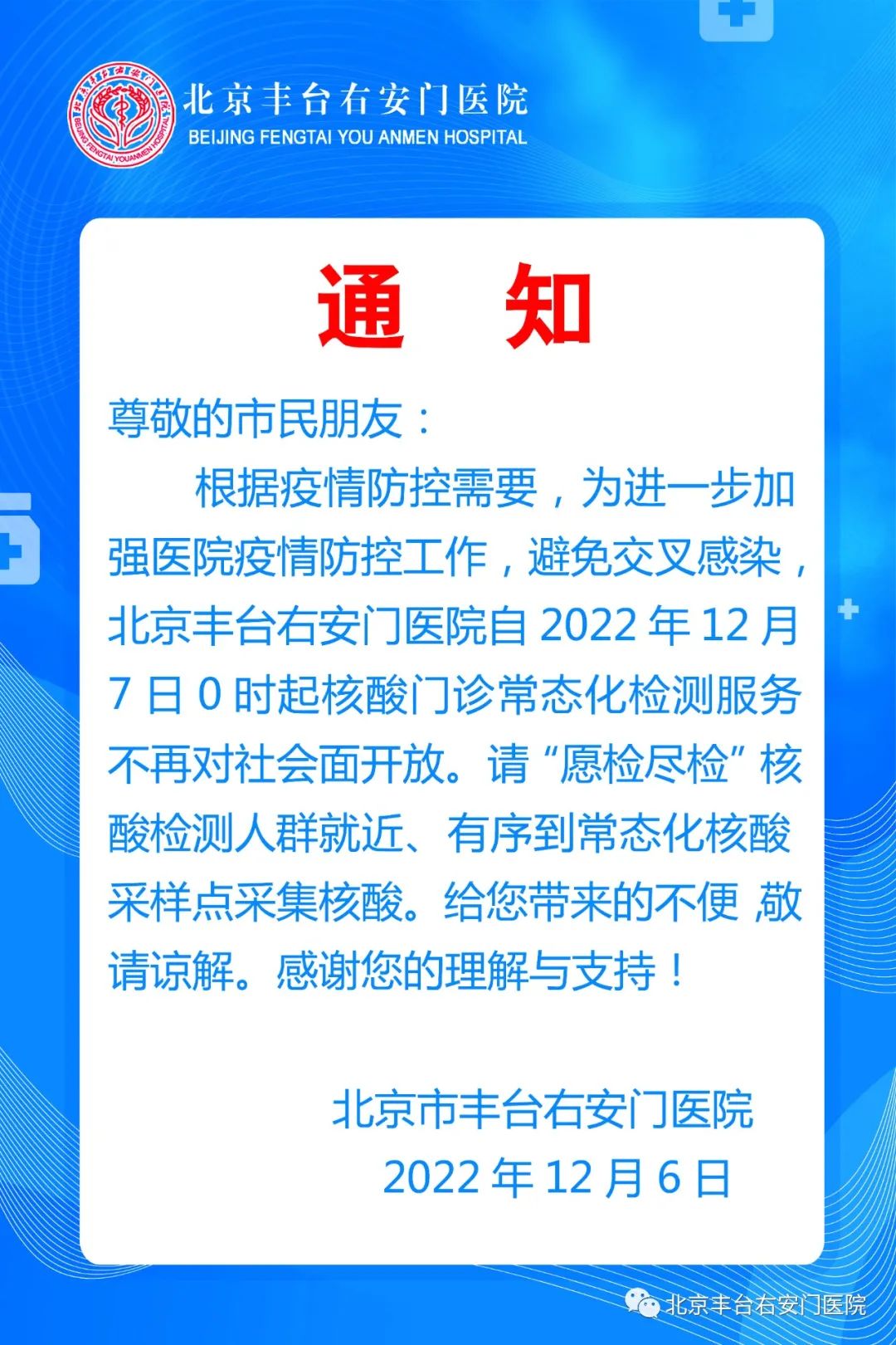 12月6日,北京豐(feng) 台右安門醫院發布核酸門診停診通知。其中提到,12月7日起核酸門診常態化檢測服務不再對社會(hui) 麵開放。