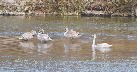 四隻疣鼻天鵝幼鳥活動在河畔淺灘。 吳嵐攝