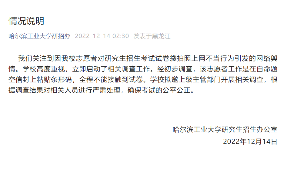 央廣網哈爾濱12月14日消息(記者馬俊瑋)12月14日,哈爾濱工業(ye) 大學研究生招生辦公室通報:我們(men) 關(guan) 注到因我校誌願者對研究生招生考試試卷袋拍照上網不當行為(wei) 引發的網絡輿情。學校高度重視,立即啟動了相關(guan) 調查工作。經初步調查,該誌願者工作是在自命題空信封上粘貼條形碼,全程不能接觸到試卷。學校擬邀上級主管部門開展相關(guan) 調查,根據調查結果對相關(guan) 人員進行嚴(yan) 肅處理,確保考試的公平公正。
