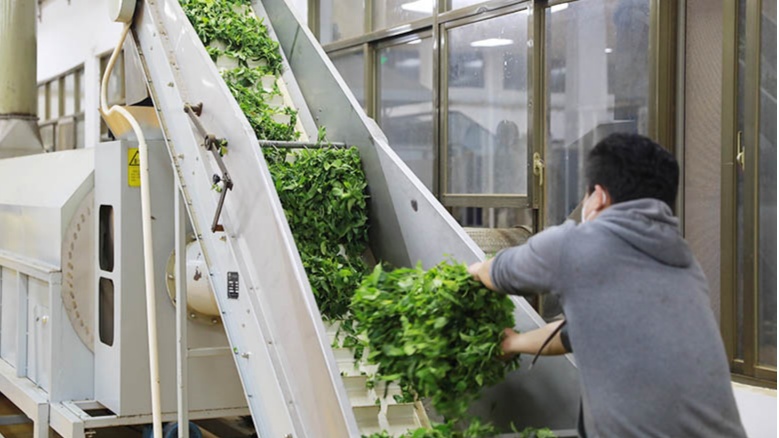 工人將茶葉投入烘幹機傳(chuan) 送帶上(央廣網發 孟凡盛 攝)