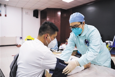 12月22日,朝陽區左家莊街道辦事處,醫護工作者為(wei) 獻血者測量血壓。新京報記者 王飛 攝