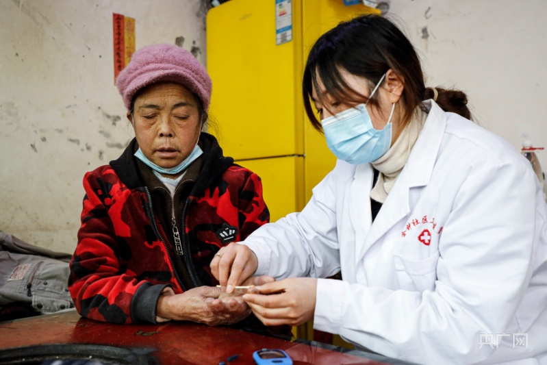 青龍街道金鍾社區醫生陳倩為(wei) 社區居民測血糖 (央廣網發 周海東(dong) 攝)