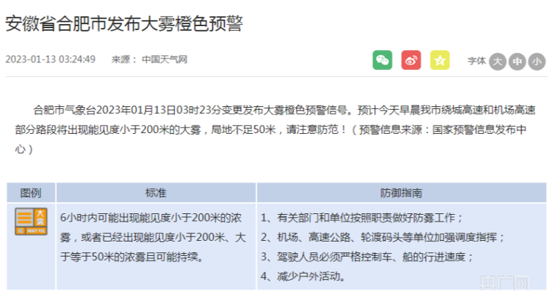 央廣網合肥1月13日消息(記者鮑玉嬋)記者從(cong) 安徽省氣象局獲悉,合肥市氣象台2023年01月13日03時23分變更發布大霧橙色預警信號。預計今天早晨我市繞城高速和機場高速部分路段將出現能見度小於(yu) 200米的大霧,局地不足50米,請注意防範!
