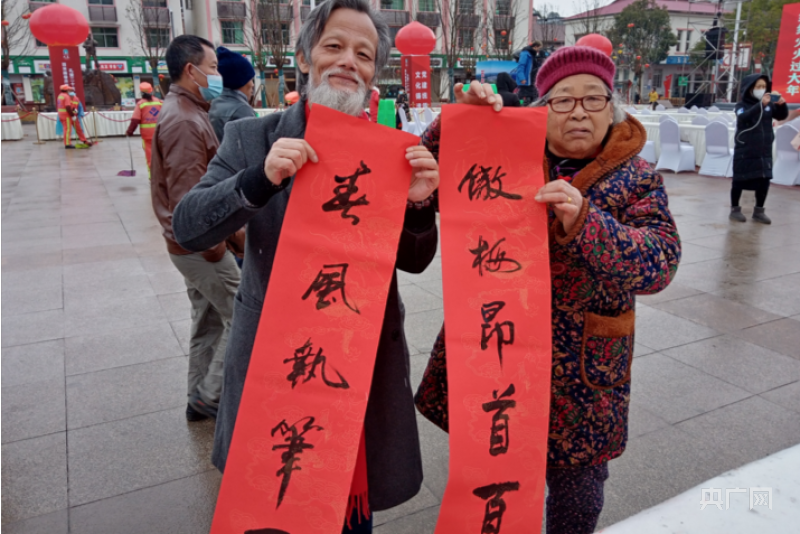 在書(shu) 法展位,藝術家們(men) 也忙碌著,現場書(shu) 寫(xie) 春聯送給當地居民。寒冷的天氣沒有阻擋藝術家們(men) 創作的熱情,他們(men) 鋪開紙、備好墨、拿起筆,將心底的祝福落於(yu) 紙上。玉龍鎮居民李昌蘭(lan) 拿著剛得到的“春風執筆一枝翠,傲梅昂首百花最”春聯笑得合不攏嘴:“我回去就把這副春聯貼在門前!”(陳發源 徐雲(yun) 卿)